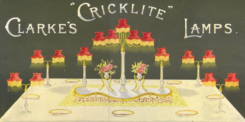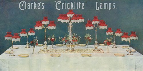The following two Clarke advertisements published in the Illustrated London News in December 1888 and 1899 illustrate formal table settings of Clarke Cricklite stands likely produced by Osler. These stands have characteristics of Osler products and are documented in the Samuel Clarke Cricklite catalogs.