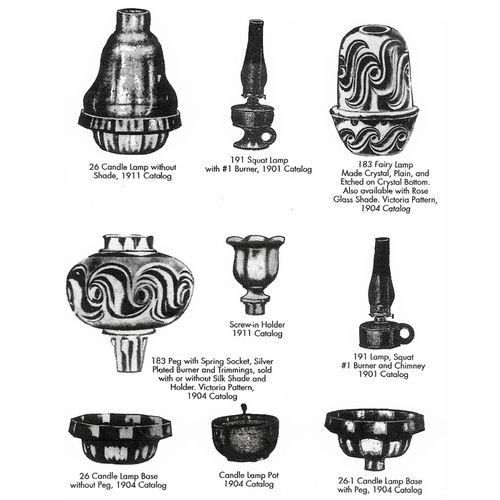 The Fostoria Glass Company was founded in 1887 in Fostoria, Ohio. They closed their doors almost 100 years later while located in Moundsville, West Virginia. Fostoria made several lamps and candle holders including full-size and miniature lamps, saucer candles, and finger candles. I am aware of only one fairy lamp that Fostoria actually called fairy and that is the Victoria pattern number 183, which Fostoria patented around 1888. It was called a Fairy Light and not fairy lamp.
