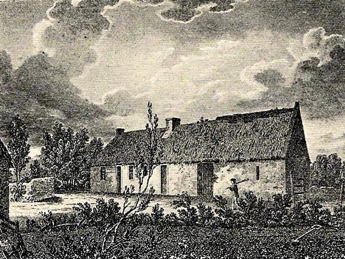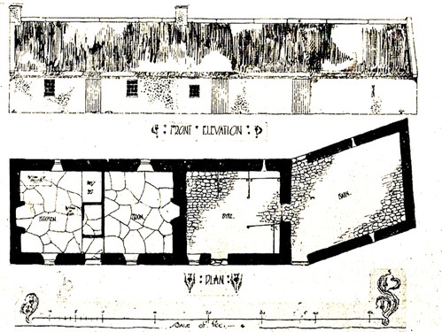 An illustration from c.1847 showing the white cottage, the far section higher than the rest, with thatched roof through which dormer windows are punctured.