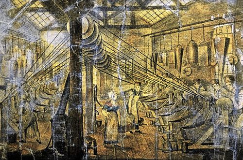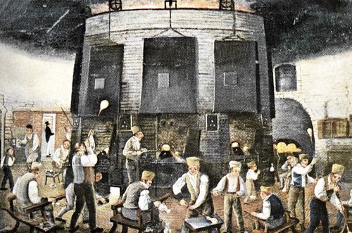 Inside the Glass Factory of Henry G. Richardson and Sons of Wordsley, Stourbridge in 1830. An oil on wood painting by Miss Emilty Hodgetts, a neice of the Richardson family.