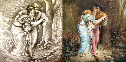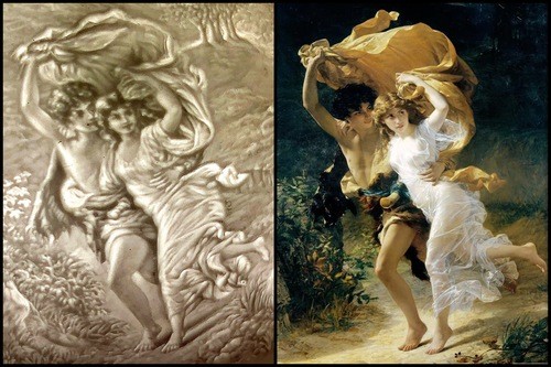 The image of the pair running under the fabric is titled The Storm by Cot as well. The painting is reminiscent of an earlier work, Springtime, which was completed by Cot in 1870. It was subsequently acquired by John Wolfe after it was displayed with astounding success at the Salon of 1873. It is believed that the presence of Spring in Wolfe's collection was the impetus that drove his cousin, Catharine Lorillard Wolfe, to purchase it in 1880. Both are of roughly the same dimensions and are evidently related in a subject in the sense that both portray a young, nubile couple. It is from this therefore, that both are thought to form a symbiotic pair, where the success of the earlier work led to the creation of the latter. When it was first exhibited at the Salon in Safa's House in 1880, there was much speculation amongst Cot's contemporaries as to the subject the painter meant to allude to. Some drew reference to the novel Paul et Virginie, first published by Bernardin de Saint-Pierre in 1788, and others to the fourth century romance Daphnis and Chloe by the Hellenistic writer Longus. Evidence for the first interpretation comes from the specific motif of the couple running from the rain and covered by a billowing drapery corresponding to a famous and often illustrated scene in Paul et Virginie: