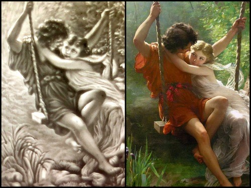 The image of the boy and girl on the swing is from the painting Springtime by Pierre-Auguste Cot. This flirtatious duo in classicizing dress, painted with notable technical finesse, reflects Cot’s allegiance to the academic style of his teachers, including Bouguereau and Cabanel. Exhibited at the Salon of 1873, the picture was Cot’s greatest success, widely admired and copied in engravings, fans, porcelains, and tapestries. Its first owner, hardware tycoon John Wolfe, awarded the work a prime spot in his Manhattan mansion, where visitors delighted in "this reveling pair of children, drunken with first love ... this Arcadian idyll, peppered with French spice." Wolfe’s cousin, Catharine Lorillard Wolfe, later commissioned a similar scene from Cot, The Storm, now also in The Met’s collection.