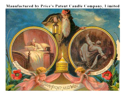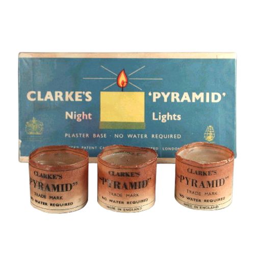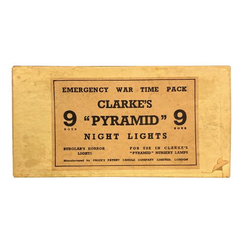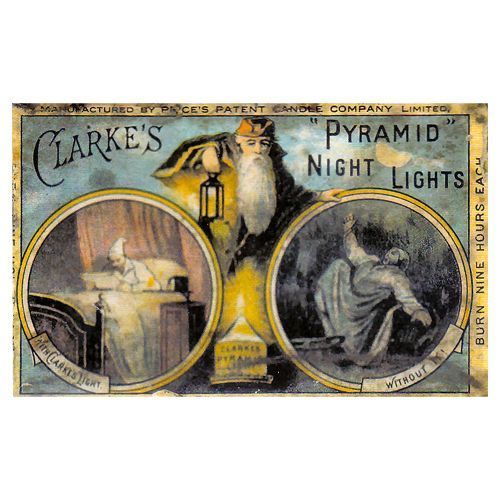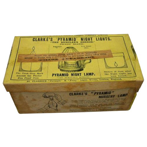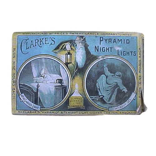 This is evident by several examples of Clarke's Pyramid Night Light boxes bearing the phrases, "Now Price's Patent Candle Company" and "Manufactured by Price's Patent Candle Company, Limited."