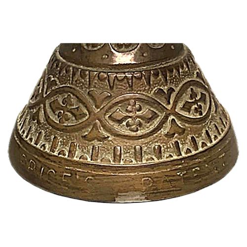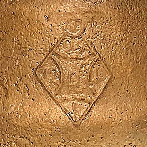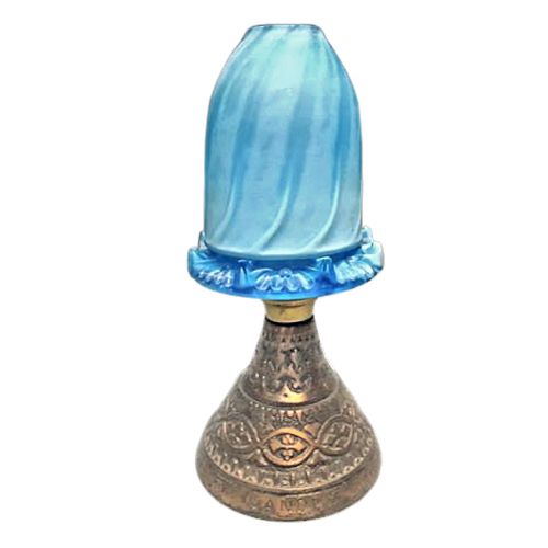 The heavy metal base is connected to a pressed slag candle holder by a brass fitting. The shade shown may not be original. However, the base could have been marketed without a shade. The base embossed around the bottom edge reads "Price's Patent Candle Co.". In addition, the base is embossed with an indecipherable lozenge. The Trefoil design on the base suggests it may have a religious association. (Click thumbnails to enlarge)